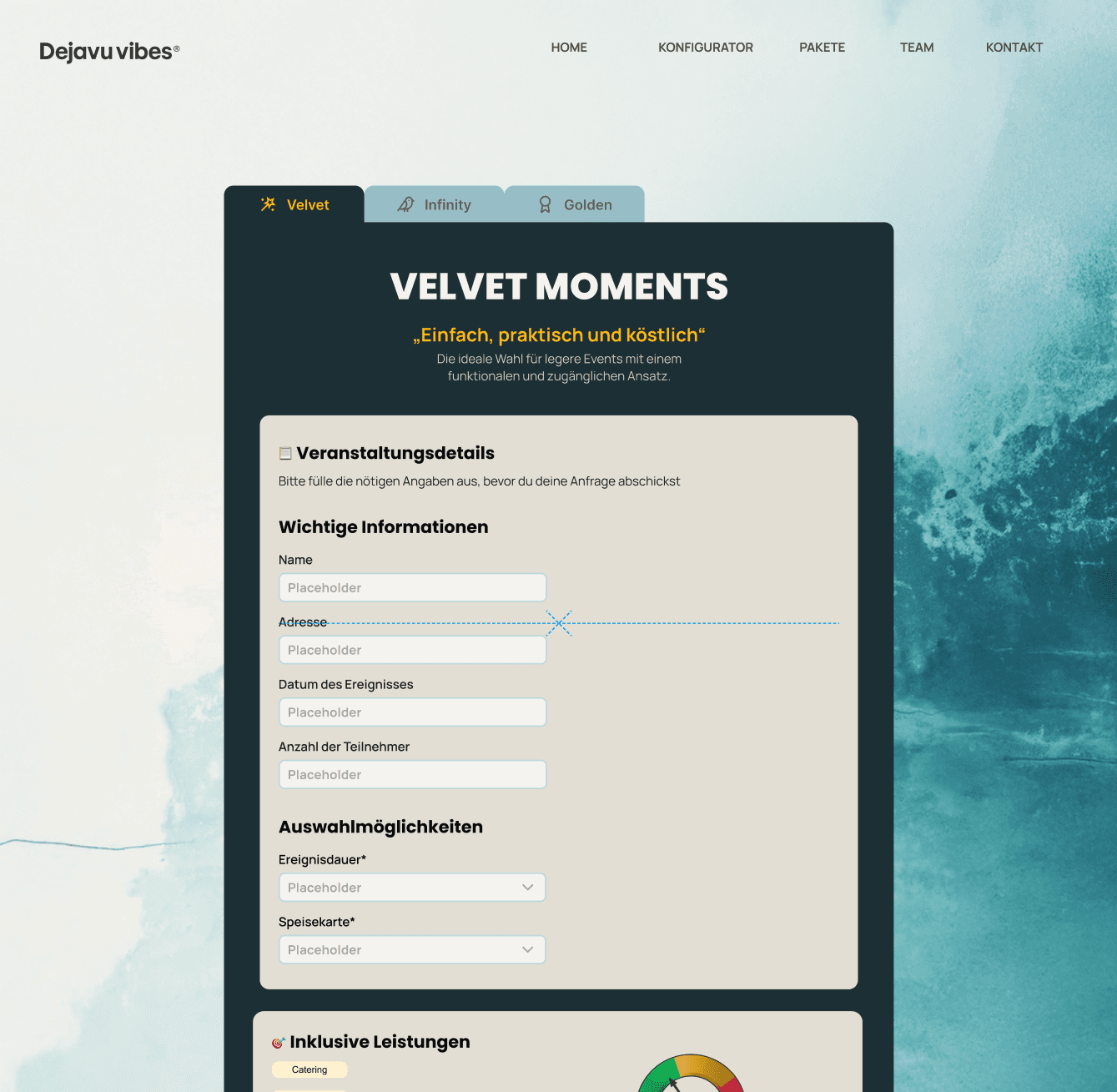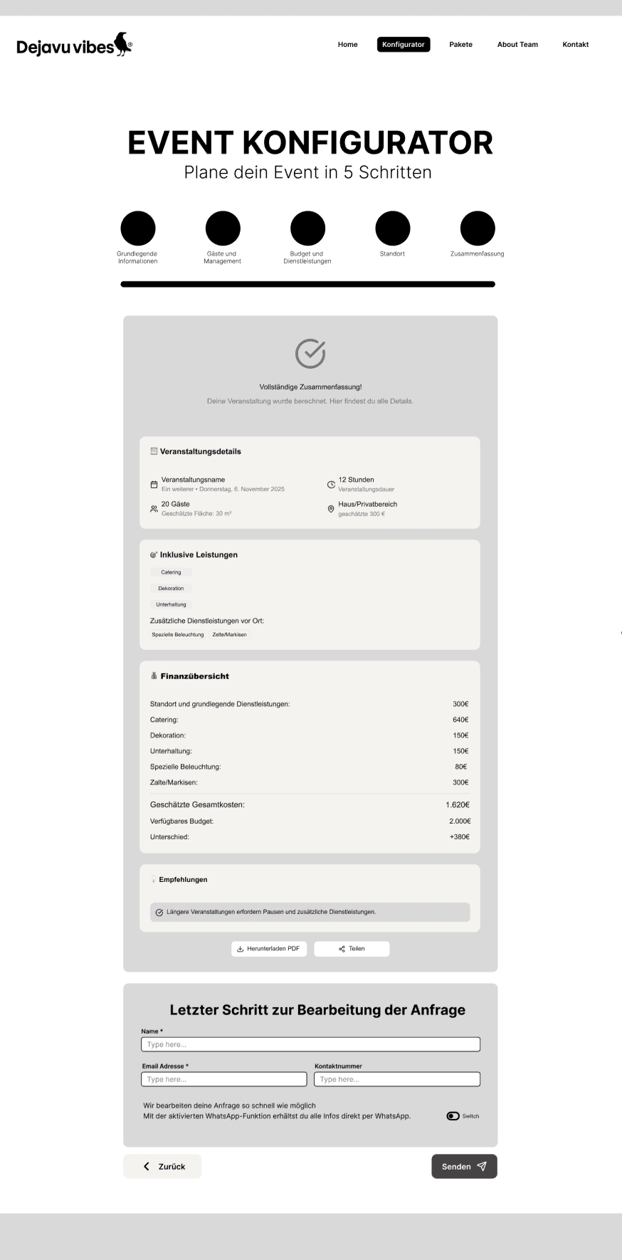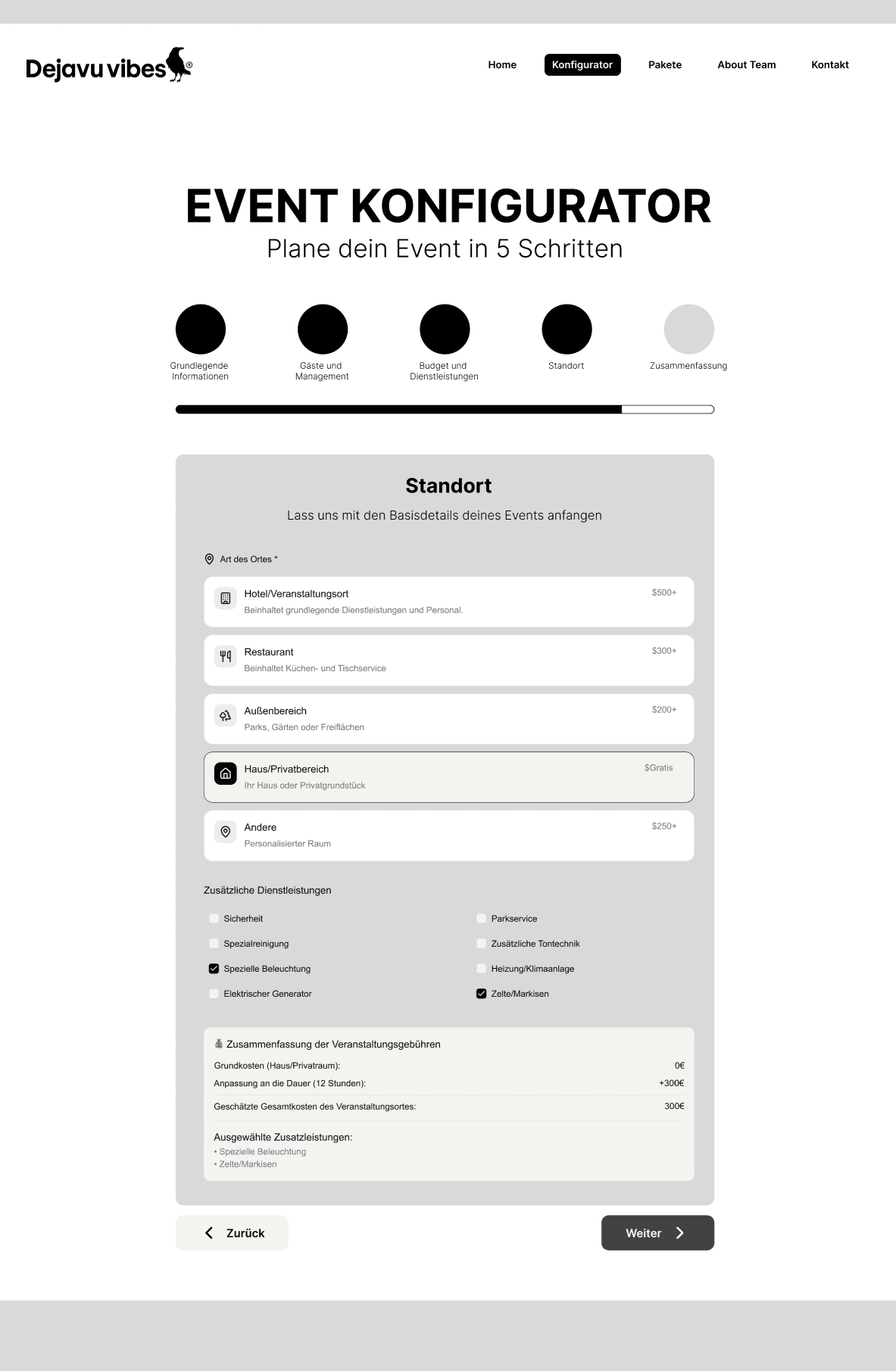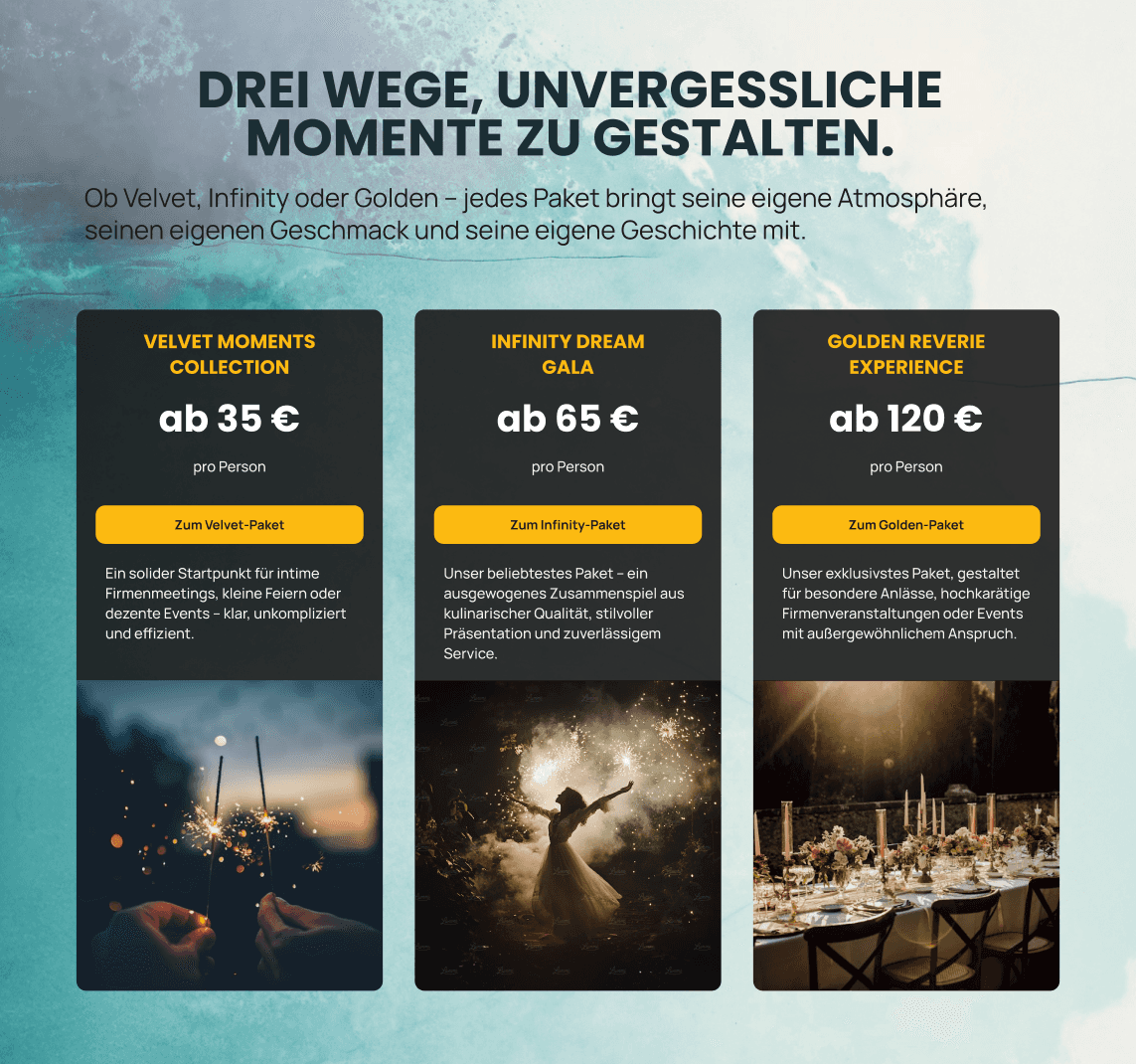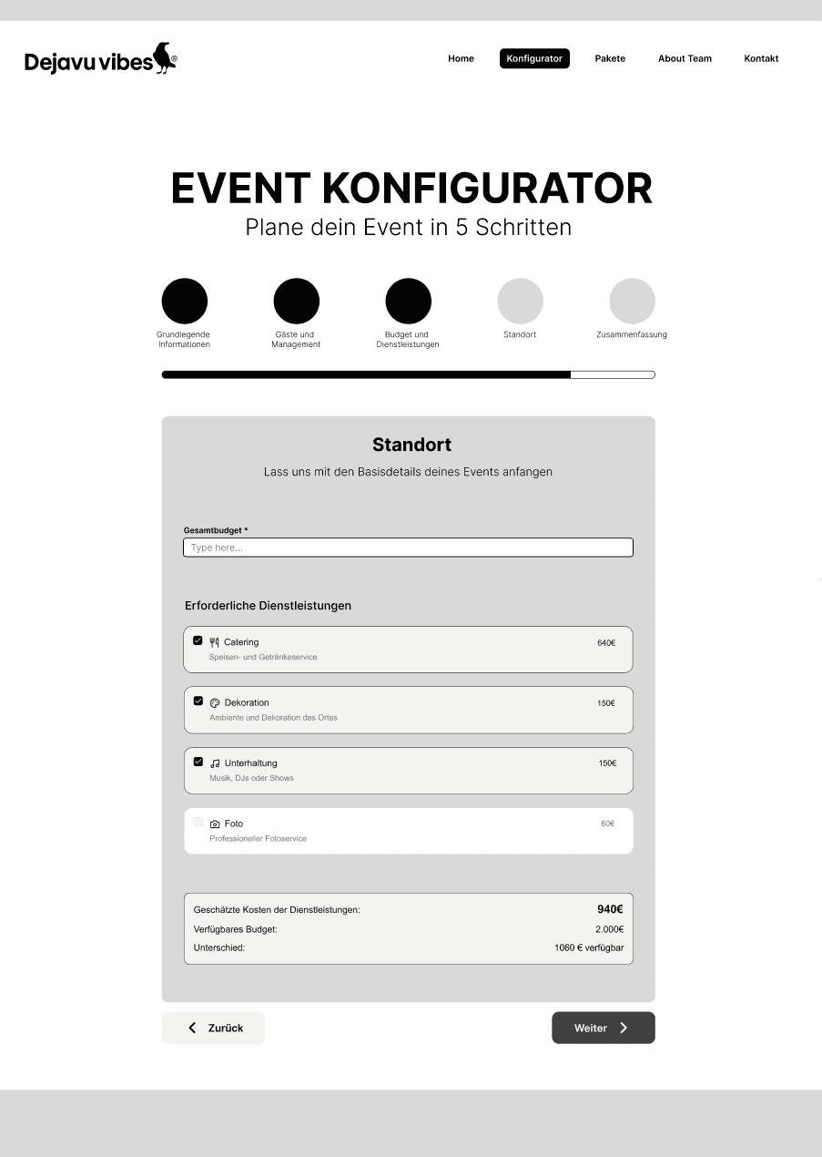 These screens are part of the core user flows — event configuration, predefined packages, and direct advisory support. They were designed to reduce uncertainty during decision-making by clearly displaying pricing and progress, offering comparable pre-defined options, and providing direct access to personalized guidance through a contact form.