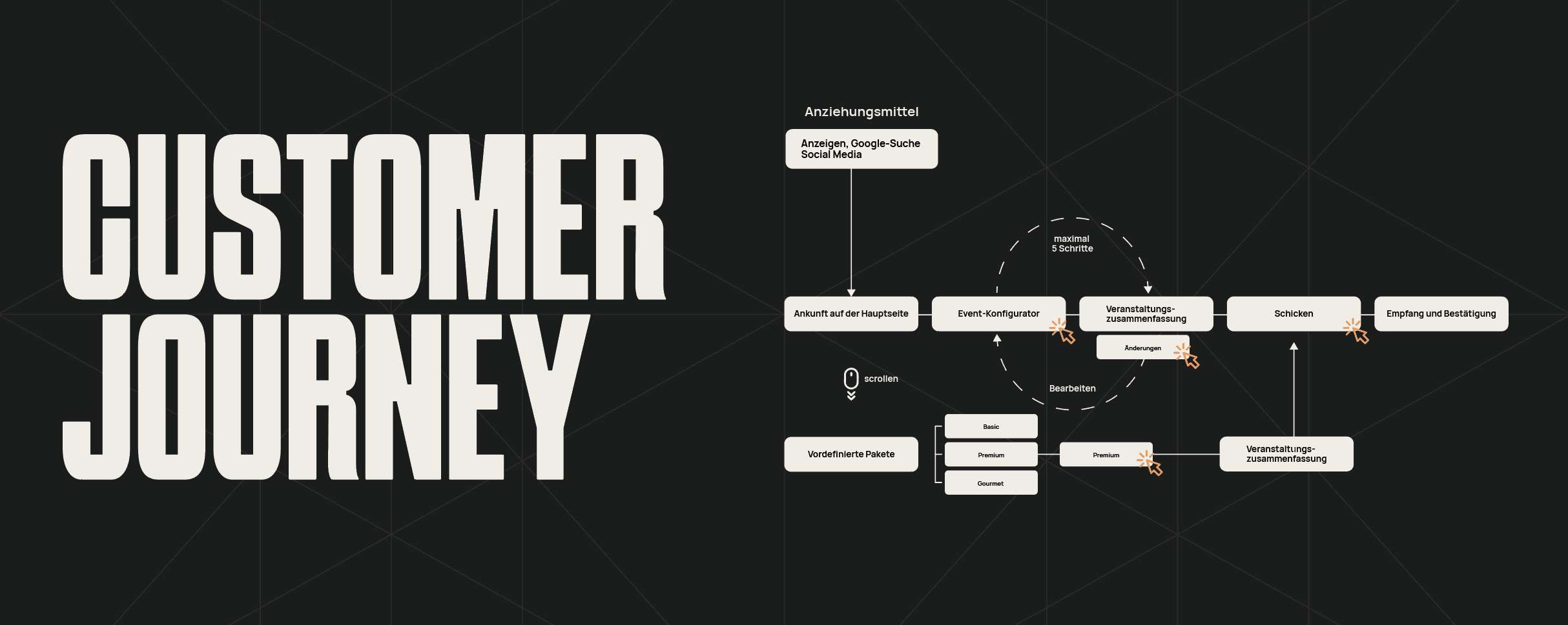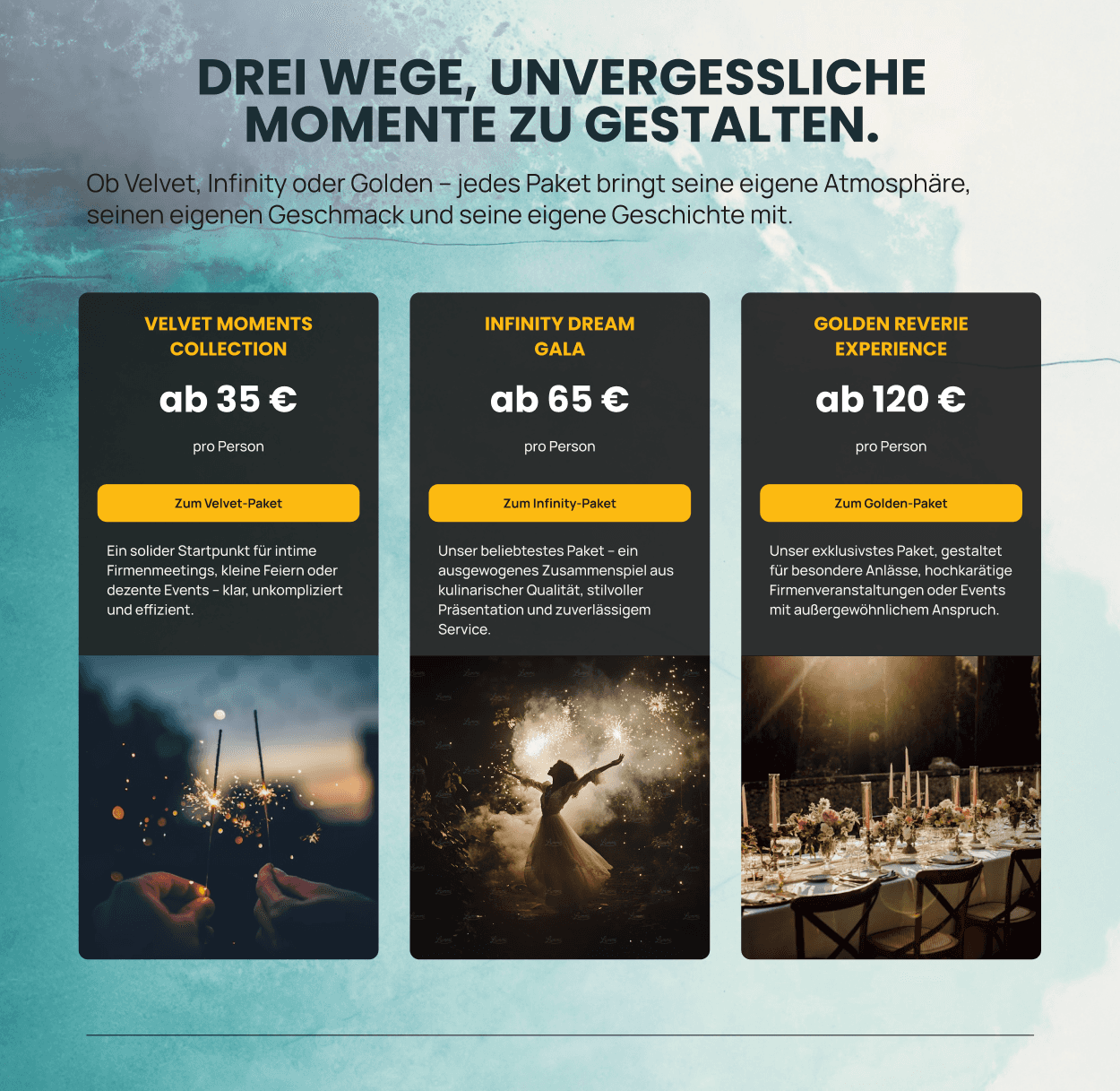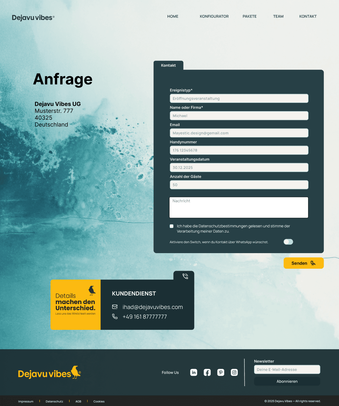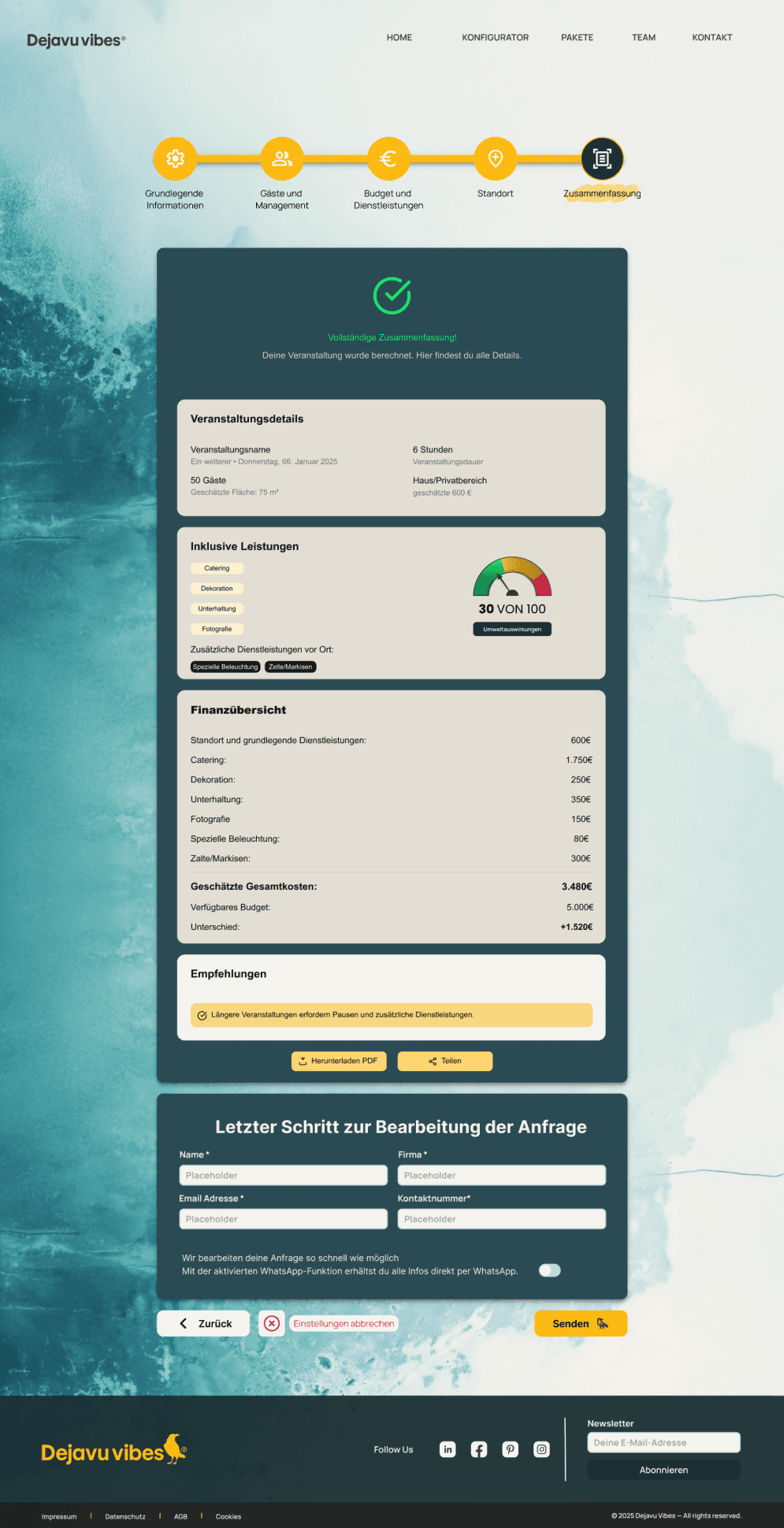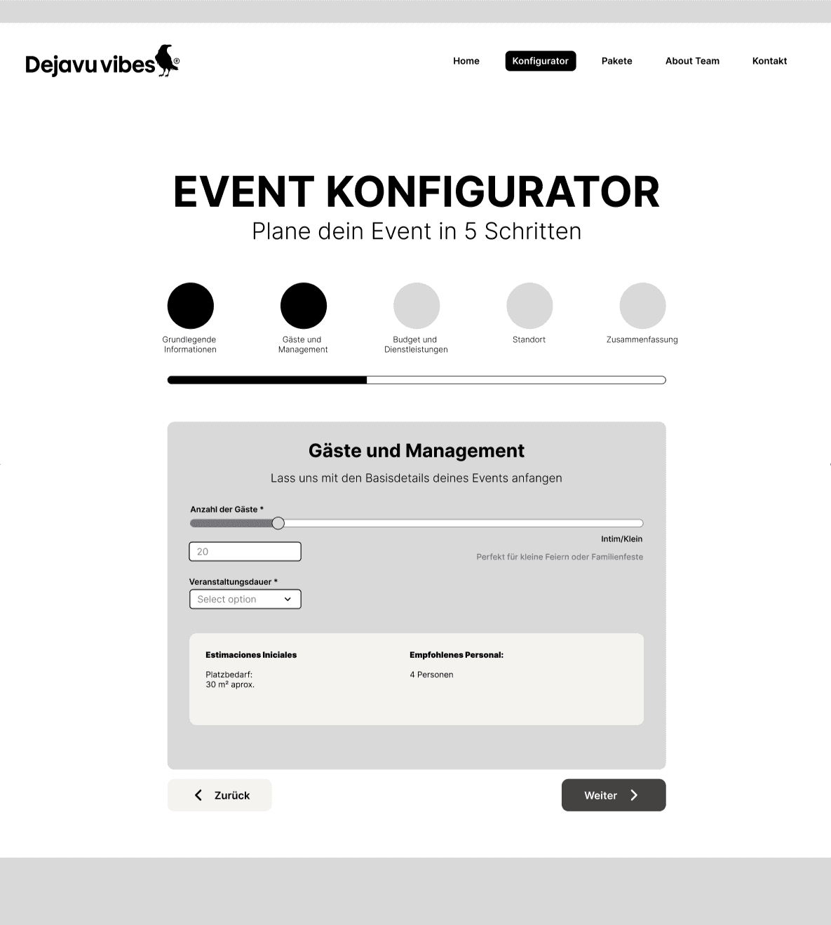 These screens are part of the core user flows — event configuration, predefined packages, and direct advisory support. They were designed to reduce uncertainty during decision-making by clearly displaying pricing and progress, offering comparable pre-defined options, and providing direct access to personalized guidance through a contact form.