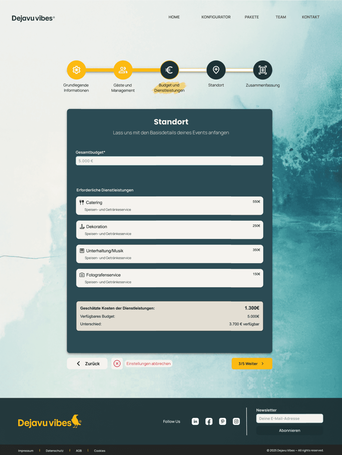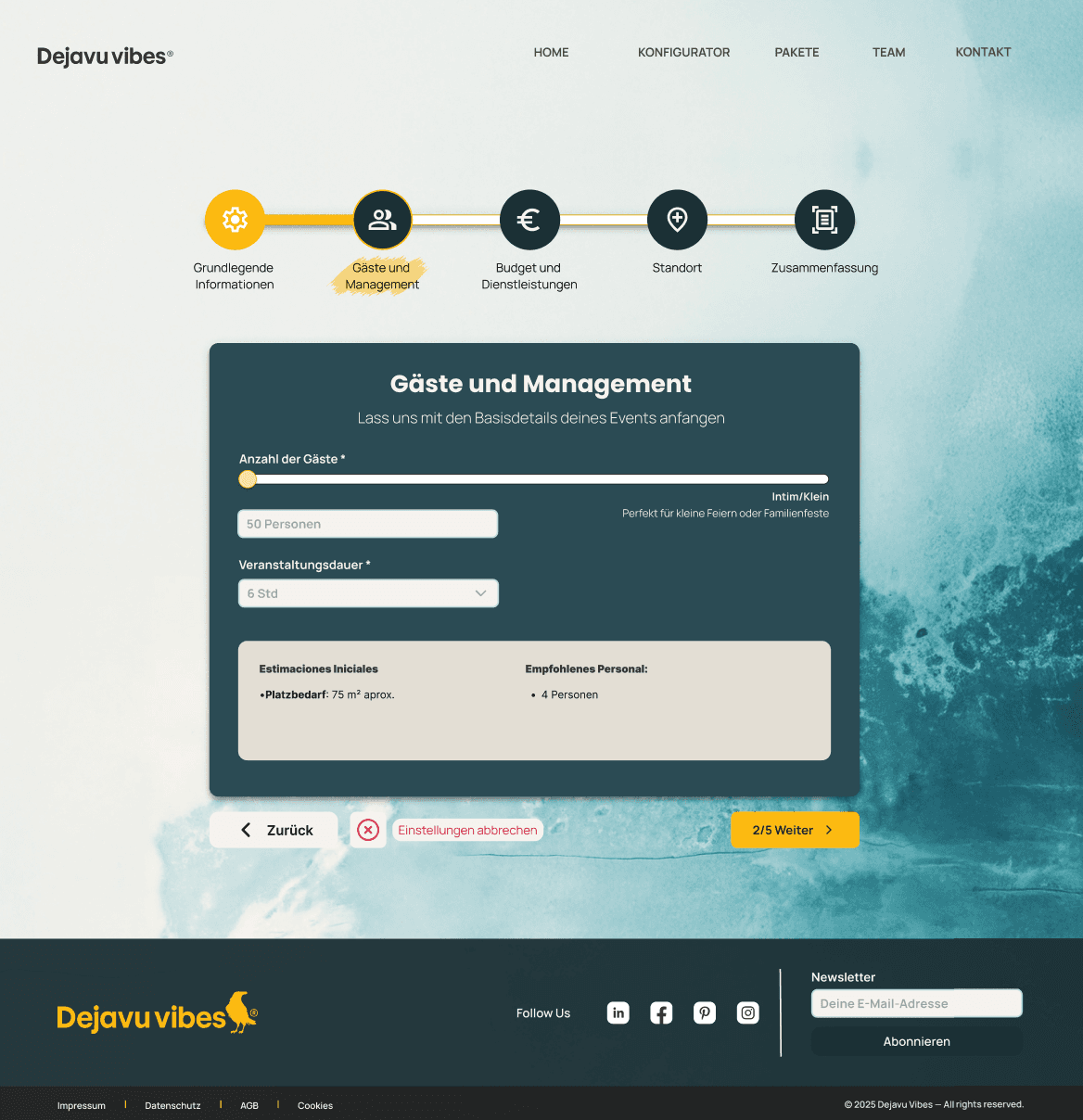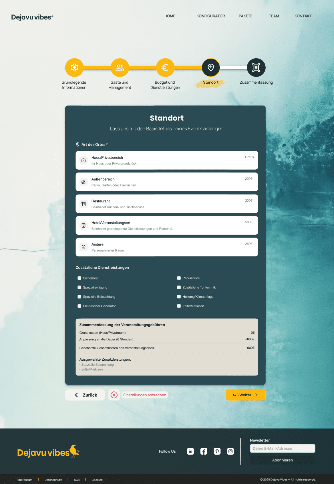 The event configurator is designed to help users plan their events with minimal friction while clearly understanding the impact of each decision in real time. Each step is carefully structured to reduce cognitive load, allowing users to explore options and variations with a single click. This approach ensures users maintain full control over every detail and gain a holistic view of the event they are planning.