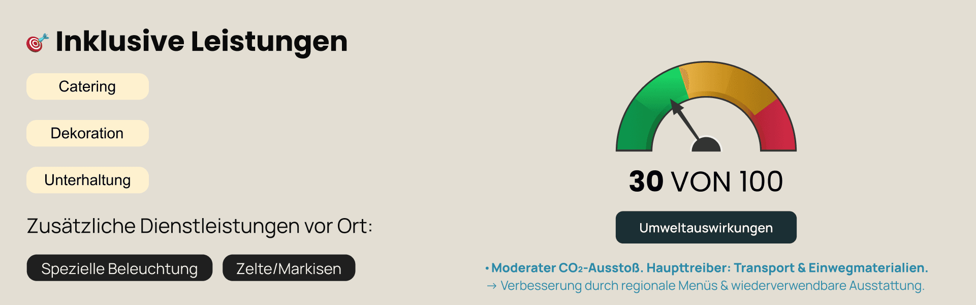From the outset, the idea of incorporating an environmental impact indicator into the event configuration process was considered. This feature was identified as a key differentiator compared to existing market solutions, as it would enable users to make more conscious and sustainable decisions while planning their events.