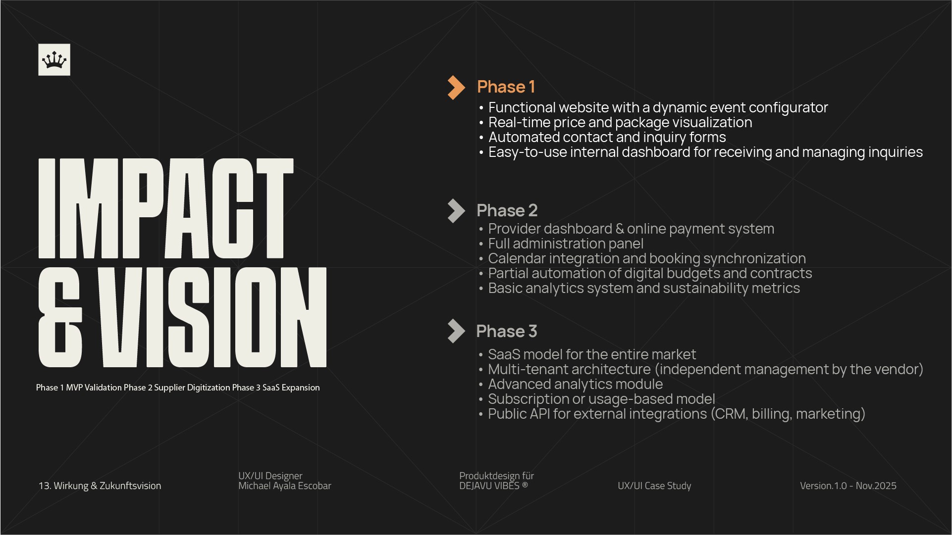 By starting with a dynamic event configurator, real-time pricing and a lightweight internal dashboard, Phase 1 validates the core problem: reducing uncertainty and friction in complex B2B decision-making. This allows the team to test real user behavior, measure impact through clear KPIs, and build confidence in the product direction.