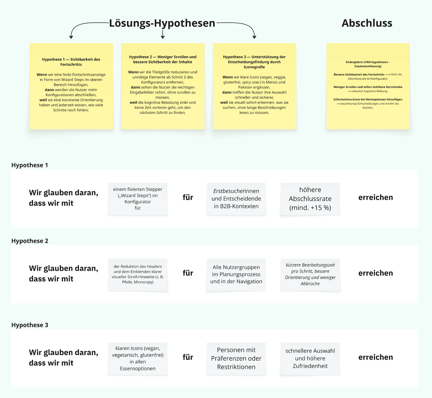 Transforming research findings into clear, testable hypotheses that align user needs with business goals.
